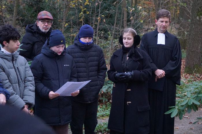 Am 23. November 2025 fand auf dem sogenannten „Russenfriedhof“ in Dorsten-Holsterhausen eine eindrucksvolle Gedenkveranstaltung für die während des Zweiten Weltkriegs in Dorsten verstorbenen sowjetischen Kriegsgefangenen und Zwangsarbeiter statt. Maßgeblich gestaltet wurde sie von Schülerinnen und Schülern der Klassen 10a und 10b des Gymnasium Petrinum. Unter Begleitung des Historikers Dr. Marius Seydel vom Volksbund Deutsche Kriegsgräberfürsorge hatten sie sich in einem Projekt intensiv mit den Schicksalen dieser Menschen beschäftigt und stellten ihre Ergebnisse vor Ort vor. Bild: Im Beisein von drei Schülern der Klasse 10b des Gymnasium Petrinum, der stellvertretenden Landrätin Martina Eißing (CDU) und Dr. Josef Ulfkotte (Verein für Orts- und Heimatkunde) übergaben Dr. Marius Seydel (r.) und Stefan Schmidt vom Volksbund Deutsche Kriegsgräberfürsorge die neu erstellte Liste der auf dem Waldfriedhof, dem „Russenfriedhof“ in Dorsten-Holsterhausen und dem Kommunalfriedhof in Dorsten-Hervest bestatteten sowjetischen Kriegsgefangenen an Bürgermeister Tobias Stockhoff.